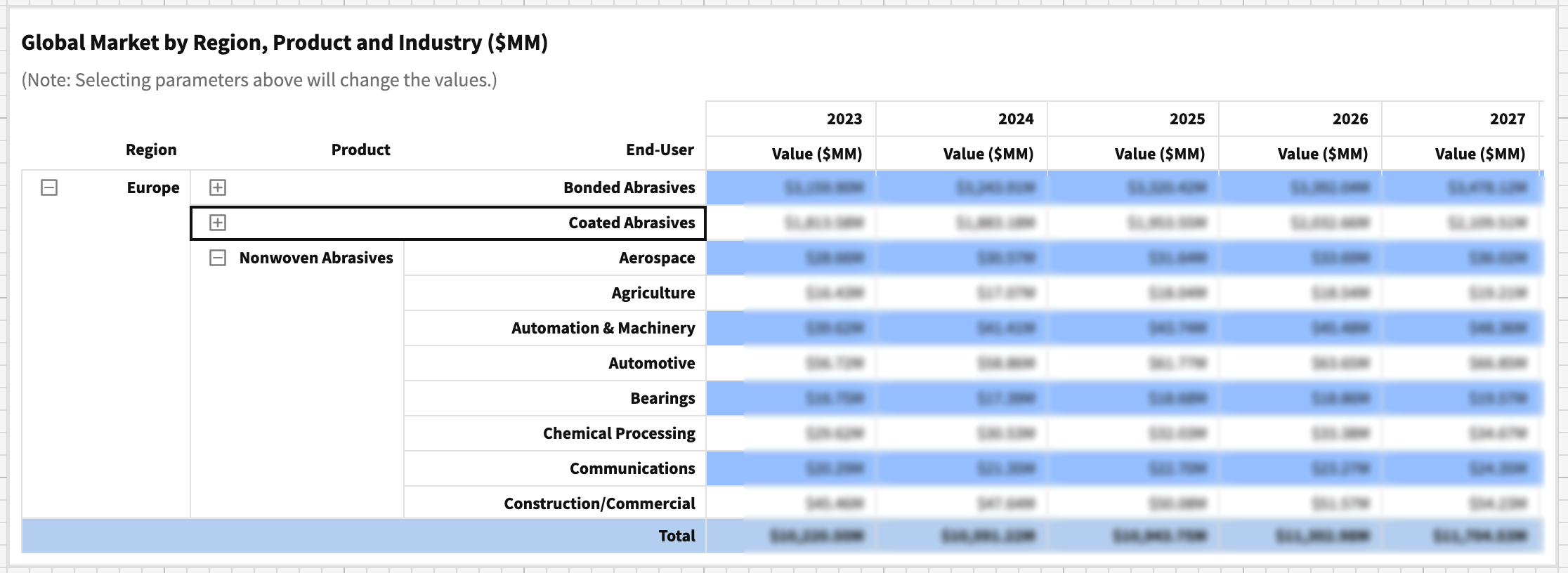 It provides market intelligence for abrasive products (coated, nonwoven, and bonded abrasives) through detailed data sets covering total consumption value by the following parameters: year, region, products, and end-user industries matching those presented in our published market intelligence report. It also offers an overview of the competitive landscape and key qualitative market insights.