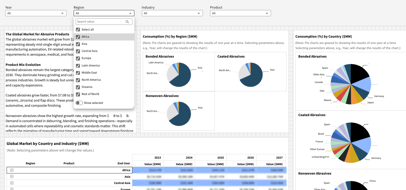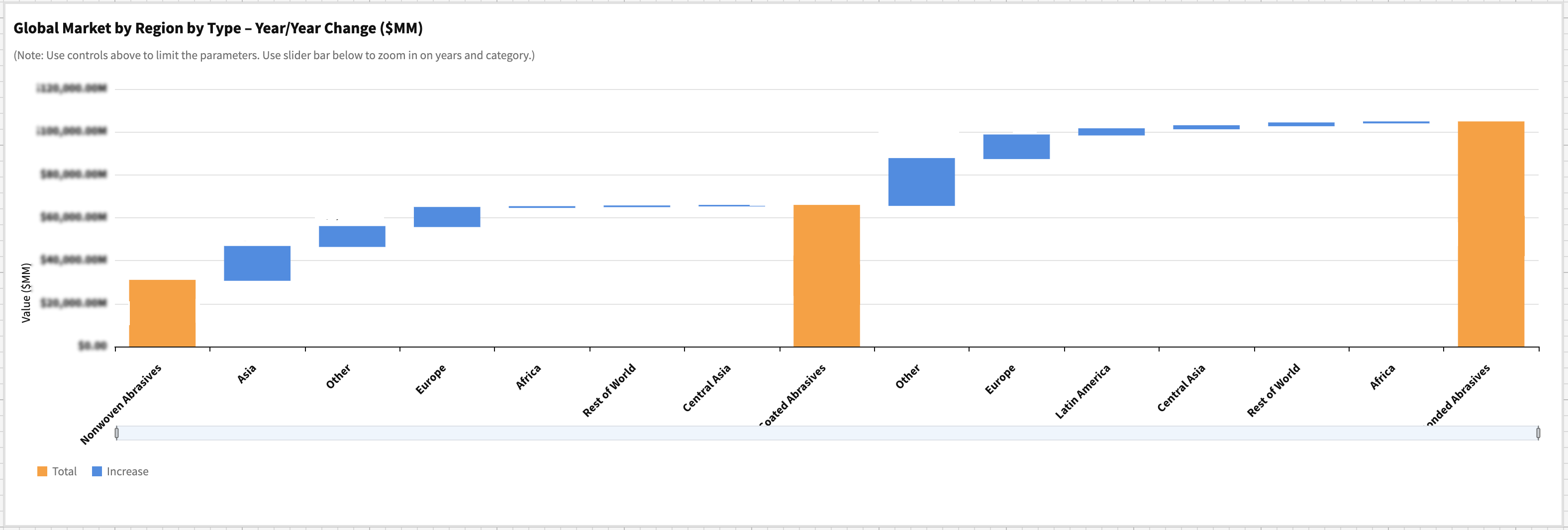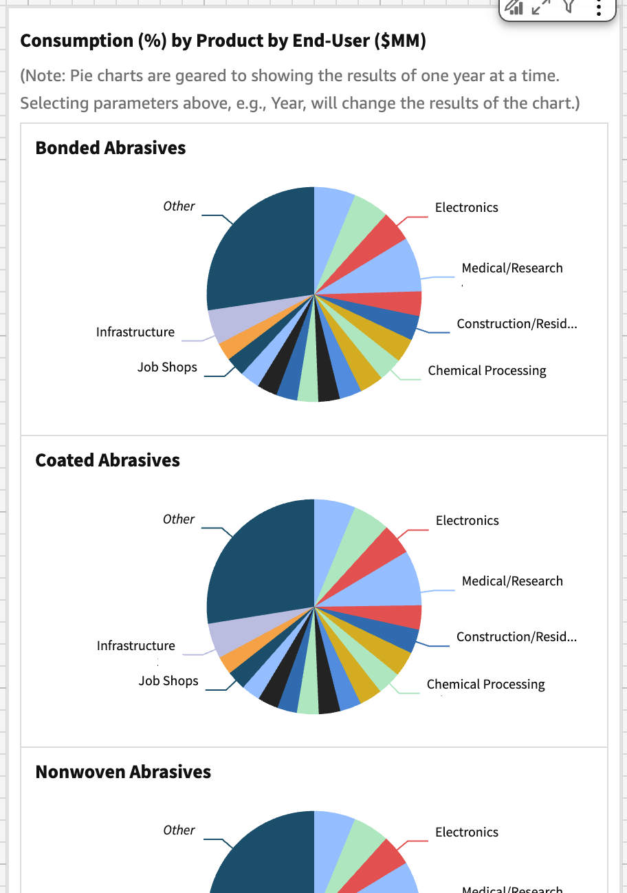 It provides market intelligence for abrasive products (coated, nonwoven, and bonded abrasives) through detailed data sets covering total consumption value by the following parameters: year, region, products, and end-user industries matching those presented in our published market intelligence report. It also offers an overview of the competitive landscape and key qualitative market insights.